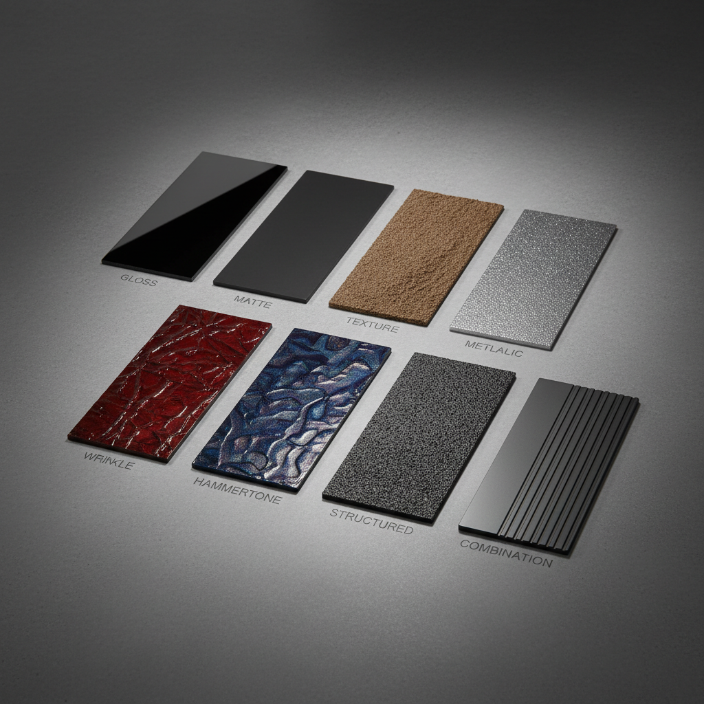 Complete guide to powder coating finishes including gloss, matte, texture, metallic, wrinkle, hammertone, and structured. Learn appearance, use cases, and benefits for Faridabad industrial applications.